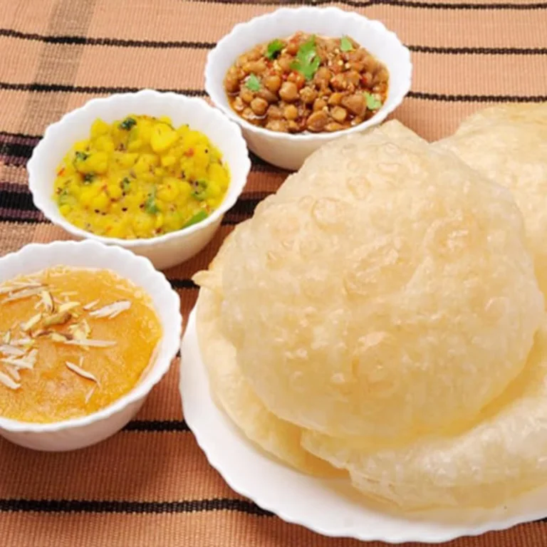 A complete halwa puri breakfast platter featuring 2 hot puris, flavorful aloo tarkari, spicy channay, sweet halwa, and a fluffy omelet, perfect for starting your day right.